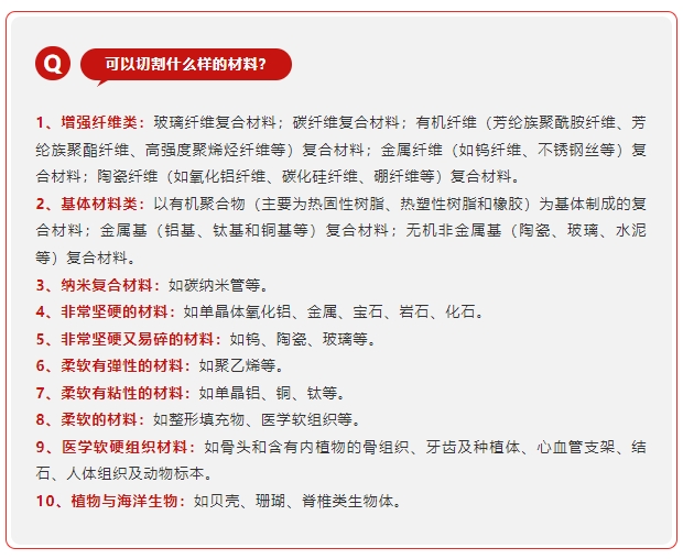 - 可切割樹(shù)脂基復(fù)合材料、陶瓷基復(fù)合材料、金屬基復(fù)合材料、熱塑性和熱固性復(fù)合材料等