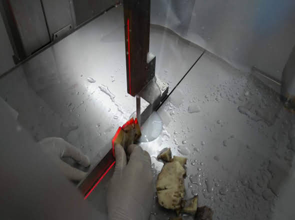 ? ? ? ?該設(shè)備的使用科室是病理科,在針對醫(yī)院病理組織分切、選擇、取材以及病理組織制樣等相關(guān)環(huán)節(jié)可以達(dá)到一次性完美解決,無齒精鋼石帶鋸式的切割工藝可以將任何鮮活的生物組織進(jìn)行切割,尤其對于切割帶有植入物種植體的組織可以充分保留切割斷面的所有信息且無切割痕跡,也不會破壞組織不同密度表面在切割過渡時產(chǎn)生的損壞。該設(shè)備的使用,顛覆了傳統(tǒng)的手工鋸、木工鋸和砂輪電鋸使用中的組織損耗、斷面破損刮花有拉絲、無法切割植入物種植體、操作繁重且危險的低效率工作,取而代之的是操作簡便、切割完美的新技術(shù)應(yīng)用。