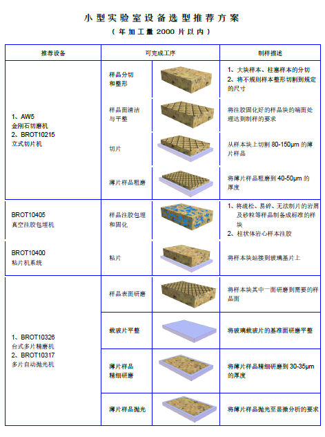 1、礦物地質(zhì)制樣小型實(shí)驗(yàn)室解決方案,是針對(duì)年常規(guī)生產(chǎn)薄片量在2000片以內(nèi)的薄片制備方法以及相關(guān)設(shè)備。這些方法和設(shè)備保證用戶可以得到非常高質(zhì)量的薄片,同時(shí)也可以滿足大量樣品的分析要求。