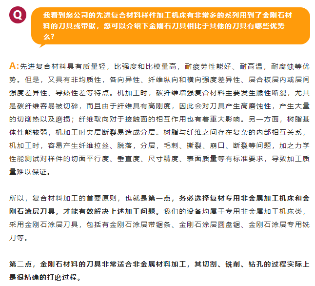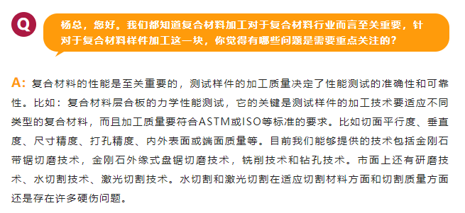 要解決好這些問題,首先是針對(duì)加工材料來選擇什么樣的技術(shù)和設(shè)備,才能適應(yīng)復(fù)材力學(xué)性能測試需要的矩形樣件,包括增強(qiáng)件的加工,薄切片,或各種異形樣件加工、打孔;其次是固定樣件加工時(shí)不移位,并且要選擇適合對(duì)應(yīng)的切割刀具和工藝來保證切割質(zhì)量,如矩形樣件切割時(shí),復(fù)材板基準(zhǔn)邊的零點(diǎn)定位切割很關(guān)鍵;第三是對(duì)于大型生產(chǎn)企業(yè)的復(fù)合材料質(zhì)控檢驗(yàn),如何解決多批次大批量且又符合ASTM標(biāo)準(zhǔn)的高效率加工問題;第四是切割軟性和硬質(zhì)復(fù)合(或鑲嵌)的材料,選擇進(jìn)給力的方式很關(guān)鍵,否則很容易損傷軟硬材料之間的結(jié)合面;第五是要根據(jù)用戶用于研發(fā)還是質(zhì)控檢驗(yàn)的目的,來為用戶提供性價(jià)比合適的技術(shù)解決方案。