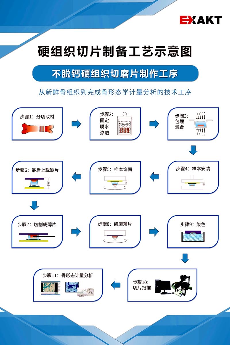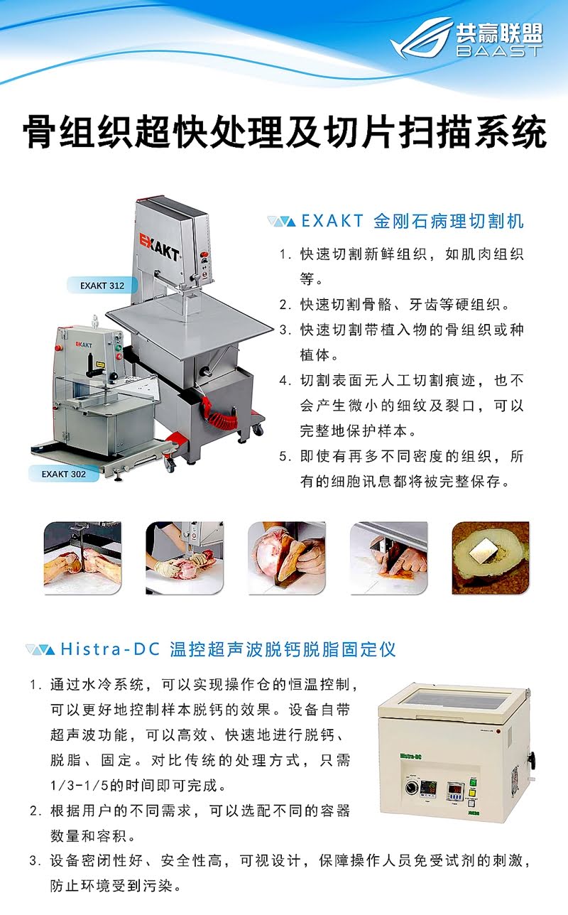 ②EXAKT生物醫(yī)學(xué)硬組織切磨系統(tǒng),EXAKT切磨系統(tǒng)是將不能用常規(guī)設(shè)備制備成組織切片的軟硬組織標(biāo)本制成不脫鈣醫(yī)學(xué)組織切片,并保持軟硬組織、組織與植入物之間的原有組織結(jié)構(gòu)形態(tài)。該切磨系統(tǒng)特殊的技術(shù)設(shè)計(jì)、技術(shù)配置以及獨(dú)特的工藝方法,均與常規(guī)設(shè)備和工藝不同。新鮮的醫(yī)學(xué)組織標(biāo)本經(jīng)過取材固定及脫水處理后,用光固化樹脂浸透、包埋、再行鋸片、磨片、染色等步驟制成厚約 10μm的醫(yī)學(xué)組織切片。采用 EXAKT 切磨系統(tǒng)設(shè)備制備的醫(yī)學(xué)軟硬組織切磨片在顯微鏡下能夠清楚準(zhǔn)確地觀察到組織的微觀結(jié)構(gòu)及其之間的相互關(guān)系。EXAKT切磨系統(tǒng)設(shè)備能為醫(yī)學(xué)軟硬組織疾病的科學(xué)研究、新材料的生物相容性研究和嵌入物研究以及醫(yī)學(xué)院教學(xué)等提供可靠的組織學(xué)評(píng)價(jià)依據(jù)。