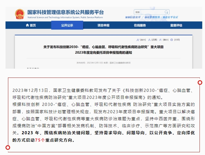 【重要通知】| 關(guān)于發(fā)布科技創(chuàng)新2030-“癌癥、心腦血管、呼吸和代謝疾病防治研究”重大項目2023