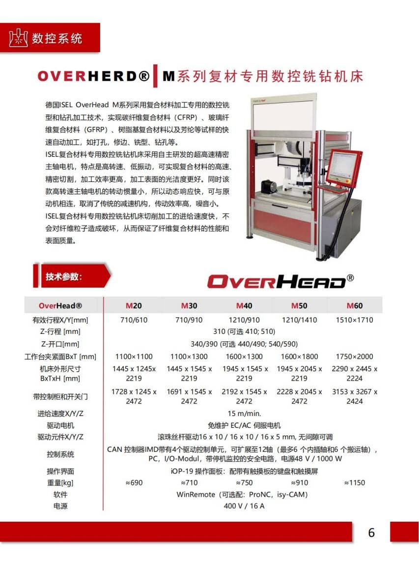 德國ISEL OverHead M系列采用復(fù)合材料加工專用的數(shù)控銑型和鉆孔加工技術(shù),實(shí)現(xiàn)碳纖維復(fù)合材料(CFRP)、玻璃纖維復(fù)合材料(GFRP)、樹脂基復(fù)合材料以及芳綸等試樣的快速自動加工,如打孔,修邊、銑型、鉆孔等。