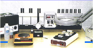 功能用途: 粘片機系統(tǒng)由微型超聲清洗器、預加熱臺、放大檢查裝置、厚度測量儀、電子天平和帶加重桿的加熱平行架組成,目的是把樣本塊粘到載薄片上。其過程是:把配好的膠涂抹到加熱的成型樣塊上,把載薄片粘到樣本塊上,然后把粘好載薄片的樣本塊放到加熱平行架上加熱1小時左右,使載薄片和樣本塊粘牢固化。 該系統(tǒng)中,超聲清洗器用于清洗樣品。預加熱臺烘干樣品。放大檢查裝置用于檢查粘片質量,防止粘片出現(xiàn)氣泡。厚度測量儀用于確認基準片標準。電子天用于配制粘片劑量。加熱壓片架用于加壓固化。
