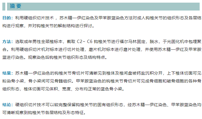 綜上,硬組織切片技術(shù)可以較完整地保留鉤椎關(guān)節(jié)的固有組織形態(tài),通過蘇木精—伊紅染色及甲苯胺藍染 色可清晰地觀察成人鉤椎關(guān)節(jié)的組織形態(tài)及各層結(jié)構(gòu)。