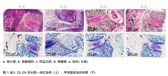 為研究鉤椎關(guān)節(jié)組織形態(tài)學(xué)結(jié)構(gòu),本實驗將蘇木精—伊紅染色和甲苯胺藍染色作為基本染色法,結(jié)合 硬組織切片技術(shù)對鉤椎關(guān)節(jié)形態(tài)學(xué)結(jié)構(gòu)進行探討。硬 組織切片技術(shù)能夠完整地保留骨組織原本的結(jié)構(gòu)及成 分,因此已成為目前最常用的觀察骨組織的方式。其對于不脫鈣的骨組織切片具有極佳的適配性,對研究骨組織成分以及骨形成有重要作用[13],對于了解生長發(fā)育及組織構(gòu)成具有極大意義。既往文獻發(fā)現(xiàn),蘇木精—伊紅染色可避免因為鈣的存在而受影響的骨組織切片[14-16]。蘇木精—伊紅染色作為標準的染色方法, 可將胞質(zhì)內(nèi)的核糖體及細胞核內(nèi)的染色質(zhì)染成紫藍色,將細胞質(zhì)染成紅色[17-18],該染色法通過陰陽離子互相結(jié)合,可起到加強固定效果[19]。在識別各種潛在的惡性病變中,甲苯胺藍是一種實用且有效的輔助診斷工具[20-21],其吩噻嗪類堿性染料的特征可將細胞核染成藍色[22-23]。本研究在對鉤椎關(guān)節(jié)的觀察中采用蘇木精—伊紅染色和甲苯胺藍染色,在保留骨組織結(jié)構(gòu)的情況下簡化了實驗步驟,又避免了脫鈣失敗對鉤椎關(guān)節(jié)切片和染色的影響,兩種染色方法相結(jié)合,可見鉤椎關(guān)節(jié)骨小梁體積、寬度及分布均勻正常,骨髓組織分布于骨小梁之間,鈣鹽沉積在周圍結(jié)締組織與椎體相通處,上下椎體和椎間盤間隔鮮明。