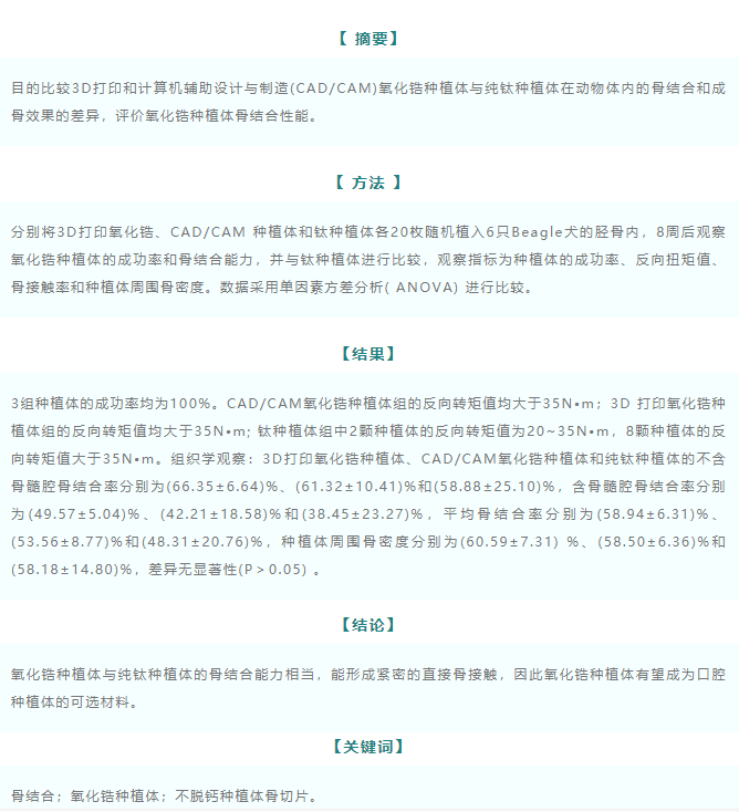 3D打印和CAD/CAM氧化鋯種植體骨結(jié)合性能的動(dòng)物實(shí)驗(yàn)評(píng)價(jià)