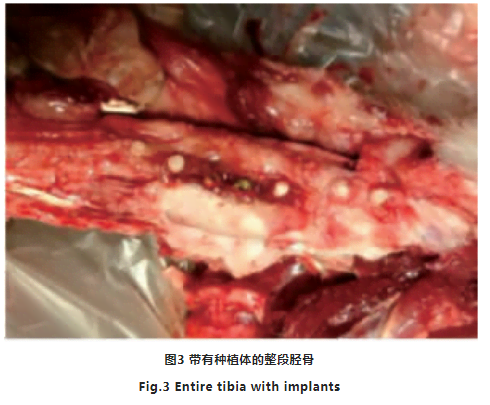 1.2.3 標(biāo)本處理在8周時(shí),取3組種植體各10枚進(jìn)行反向扭矩測(cè)試,將扭力扳手與種植體垂直相接,緩慢擰出種植體,扭力扳手刻度顯示將種植體擰松的扭力值即為旋出扭力峰值。隨后處死Beagle犬,將帶有種植體的脛骨整段鋸下(圖3),生理鹽水反復(fù)沖洗,固定后制備不脫鈣硬組織切片。