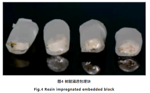 1.2.4 不脫鈣種植體骨切片的制備和染色用4%的甲醛固定浸泡,4℃冰箱保存72h,然后用70%乙醇溶液浸泡。修整帶種植體的標(biāo)本,標(biāo)本大小約5mm×15mm×10mm,在Exakt510 脫水儀中使用70%~100%的乙醇溶液梯度脫水,在Exakt520光固化包埋機(jī)中進(jìn)行樹脂浸透包埋和聚合(圖4)。完成聚合反應(yīng)后,準(zhǔn)備A、B 兩張載玻片,用Technovit 4000粘接劑把標(biāo)本包埋塊粘合于載玻片A上,將載玻片A吸附于切片機(jī)夾具上,修整組織塊,使用Exakt 400CS 磨片機(jī)對(duì)標(biāo)本表面進(jìn)行拋光,然后用Technovit-7210VLC膠水將載玻片B粘合于標(biāo)本的拋光面?zhèn)?,形成兩?cè)載玻片、中間組織塊的雙夾結(jié)構(gòu)。將載玻片A吸附在Exakt 300 CP a切片機(jī)夾具上,將切割厚度設(shè)定為150~200μm,切下載玻片B側(cè)約150μm厚的切片,使用SiC和Al2O3砂紙自動(dòng)磨片,設(shè)置厚度為30μm,再用細(xì)砂紙進(jìn)行切片表面拋光,最終制作出厚度約為30μm的光滑種植體骨磨片。將切磨好的骨切片使用雙蒸水進(jìn)行超聲清洗10min,自然干燥后用亞甲基藍(lán)-酸性品紅色,樹脂封片。