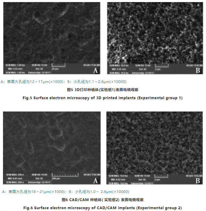 2.1 兩組氧化鋯種植體表面處理后掃描電鏡觀察結(jié)果見圖5~6,可見經(jīng)噴砂+酸蝕后的氧化鋯表面形成均勻的粗化效果。3D打印組表面大孔徑12~17μm,小孔徑1.1~2.6μm。經(jīng)噴砂+酸蝕后的CAD/CAM組表面大孔徑18~21μm,小孔徑1.0~2.6μm。