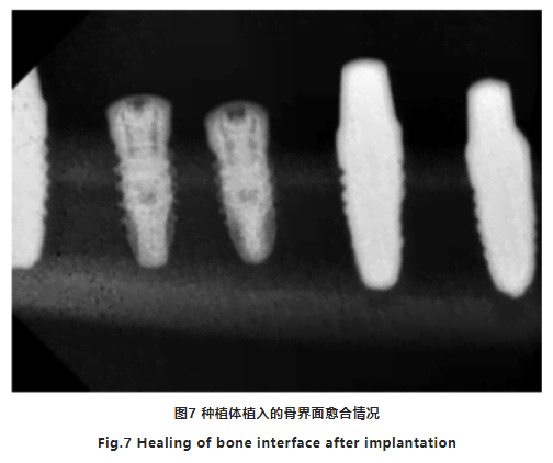 術(shù)后離體的Beagle犬脛骨經(jīng)便攜式X線機(jī)拍照,得到種植體植入的骨界面愈合情況(圖7) 。種植體和周圍骨組織嵌合緊密無(wú)間隙存在,螺紋均位于骨平面以下,光滑面均位于脛骨骨皮質(zhì)外,植體植入方向與骨面垂直,植體之間的間距在2~3 mm,植體周圍未見異常透射影像。三組種植體的成功率均為100%。