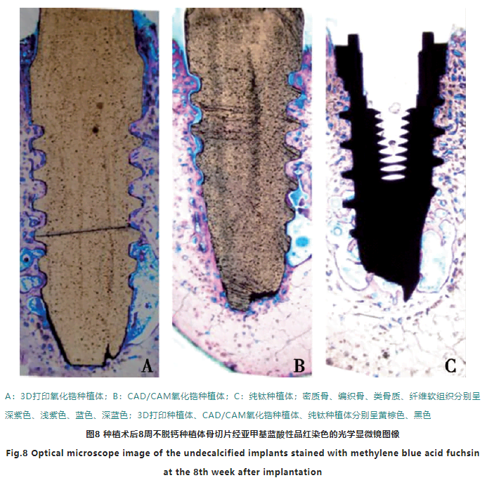 2.4 亞甲基藍(lán)-酸性品紅染色、骨接觸率測(cè)定(圖8)為種植體植入8周后,3D打印氧化鋯種植體、CAD/CAM氧化鋯種植體和純鈦種植體的亞甲基藍(lán)酸性品紅染色圖。亞甲基藍(lán)酸性品紅染色可清晰顯示新舊骨組織邊界和成骨細(xì)胞,便于區(qū)分軟硬組織。圖中可看到紫紅色的是骨小梁,藍(lán)色的是間質(zhì)。新生的編織骨較疏松,染色較深紫色;密質(zhì)骨為淺紫色,骨小梁間的纖維網(wǎng)狀結(jié)構(gòu)為淺藍(lán)色,纖維軟組織呈深藍(lán)色,藍(lán)色為類骨質(zhì)。另外,位于螺紋表面可以看到較粗的新生骨小梁。3組種植體不含骨髓腔骨結(jié)合率、含骨髓腔骨結(jié)合率、平均骨接觸率和種植體周圍骨密度數(shù)值如(表1)所示,差異均無(wú)顯著性(P>0.05)。
