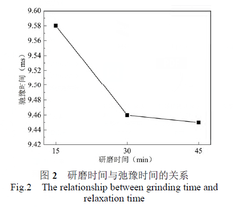 采用低溫納米材料制備分散機(jī)對(duì)原始漿料納米均質(zhì)分散,將分散好的漿料進(jìn)行三輥研磨,研磨時(shí)間分別為15分鐘、30分鐘、45分鐘,將研磨后的漿料進(jìn)行過濾,制備好的電子漿料按照1.3.4進(jìn)行漿料分散性的測試,弛豫時(shí)間如圖2所示。