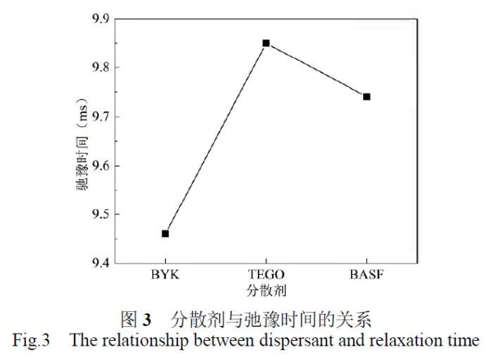 分別添加了相同含量的BYK、TEGO、BASF三種不同分散劑,配制成原始漿料。低溫納米材料制備分散機(jī)對(duì)原始漿料進(jìn)行納米均質(zhì)分散,將分散好的漿料進(jìn)行三輥研磨和過濾,制備好的電子漿料按照1.3.4進(jìn)行漿料分散性的測試,弛豫時(shí)間如圖3所示。