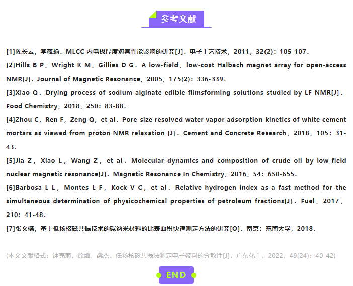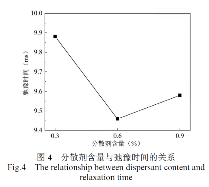 用滴管分別吸取已制備好漿料0.5mL,裝到測試的試管容器中,將石英試管插入儀器中,采用低場核磁共振儀進(jìn)行測試,得到漿料的弛豫時(shí)間。低場核磁共振儀的磁場強(qiáng)度為0.3T,頻率為13MHZ,溫度為25℃。