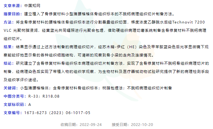 [10] 朱福余, 袁暾, 張杰, 等. 含植入物不脫鈣骨組織病理切片技術在骨組織形態(tài)學研究中的應用[J].醫(yī)療裝備, 2020, 33(19): 30-34