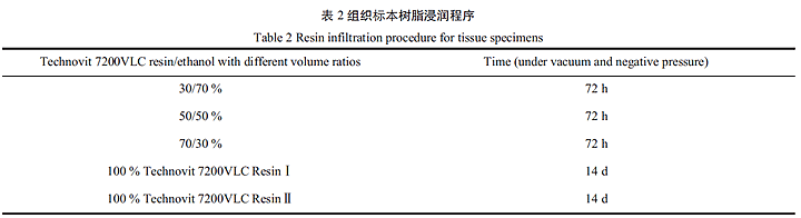 骨組織標本采用石蠟包埋法進行病理切片制作時,必須先用乙二胺四乙酸二鈉(EDTA)、硝酸、甲酸等脫鈣液對骨組織標本進行脫鈣處理[6-8]。在骨組織內埋置有植入物的情況下石蠟包埋組織切片并不適用,原因是硬化后的石蠟雖具有一定的硬度,但其硬度不足以支撐去切組織內包埋的植入物,切片過程會造成蠟塊碎裂[9-11]。