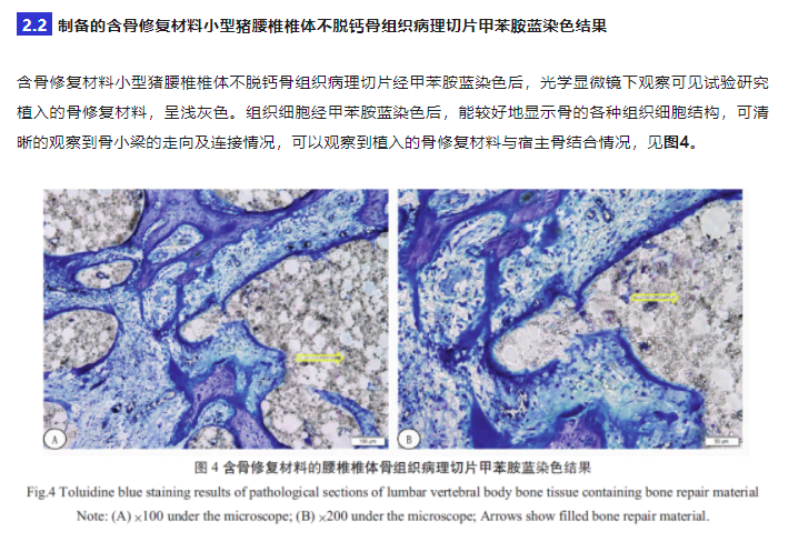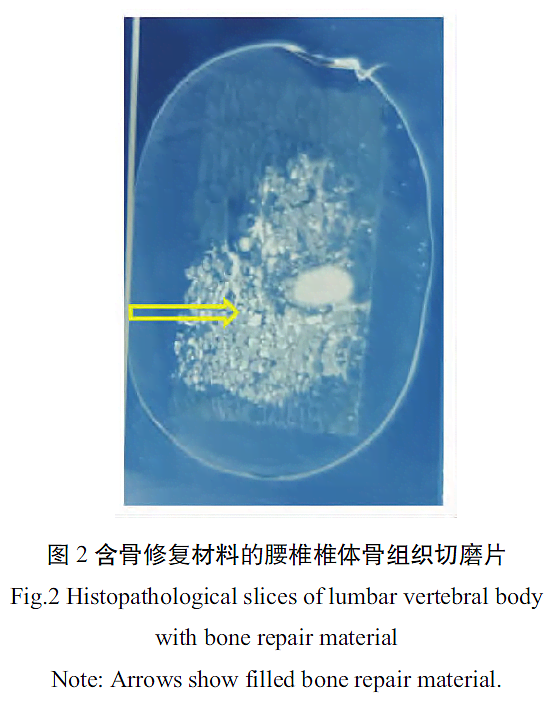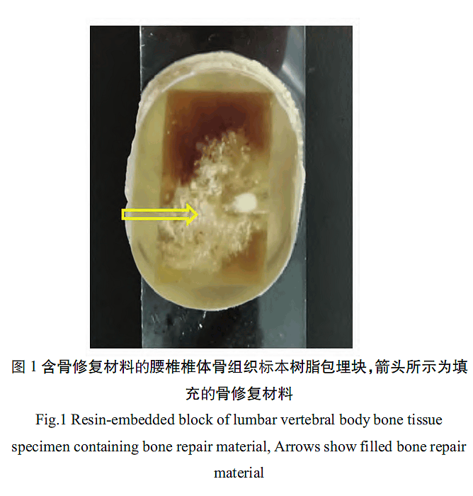 用于骨修復的生物材料及器械在進行臨床試驗前均需要進行臨床前安全性和有效性動物試驗研究,以預測其應用于臨床可能發(fā)生的不良作用[1,2]。骨修復材料的動物試驗研究需要制備合適的骨缺損動物模型,將骨修復材料植入到制備的骨缺損區(qū)域,評價骨缺損部位的局部炎癥反應、骨整合程度、骨重建情況,對該骨修復材料的安全性及有效性進行評價[3,4]。生物材料及醫(yī)療器械動物試驗周期結束后,需要剖檢、取樣,切取連帶植入物及其周邊骨組織進行病理組織切片制備,以觀察生物材料及醫(yī)療器械與宿主骨組織結合界面的結合情況及其在動物體內的吸收降解情況。與普通的石蠟包埋組織切片制備方法相比,埋置有植入物的骨組織標本進行組織切片制備時采用樹脂包埋病理組織切片制備方法不需要進行脫鈣處理,不需要額外剔除組織內埋置的植入物,可完整的觀察到植入物與宿主骨組織結合界面的組織反應情況,實現(xiàn)對植入物與骨組織結合界面組織細胞學變化的研究。本研究對植入了骨修復材料小型豬腰椎椎體不脫鈣病理組織切片制備方法進行了研究,以期能為相關研究人員提供參考。