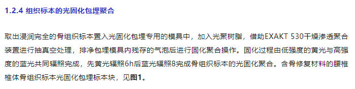 樹脂包埋法制備病理組織切片與常規(guī)" 石蠟包埋組織切片" 相比,制片步驟更為復雜繁瑣,制片周期更長,組織標本需要歷經組織切割暴露切面、梯度乙醇脫水、不同體積比的Technovit 7200VLC 樹脂/乙醇混合液浸潤、光聚合包埋、制備平行粘片,切片、磨片,才可制備出一張不脫鈣的骨組織病理切片。