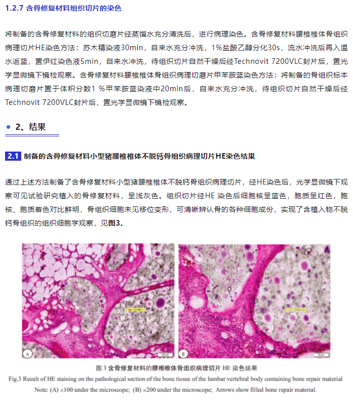 本研究制備的含骨修復材料腰椎椎體不脫鈣病理組織切片,光學顯微鏡下可清晰觀察骨缺損部位植入骨修復材料后組織結合界面骨的各種組織細胞結構,可進行骨缺損修復后骨組織重建進程及炎癥反應研究,適用于生物材料及醫(yī)療器械臨床前動物試驗安全性評價的組織病理學研究。