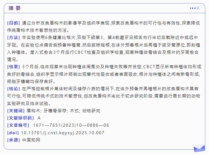 根片的命運(yùn)也是值得關(guān)注的問(wèn)題。以往傳統(tǒng)盾構(gòu)術(shù)中,Siormpas等[19]在一項(xiàng)臨床研究中報(bào)道在術(shù)后48個(gè)月時(shí)1例根片根尖約1.5mm 部分出現(xiàn)替代性吸收,原因可能是原先該位點(diǎn)存在根尖肉芽腫。Calvo-Guirado等[11]在動(dòng)物實(shí)驗(yàn)中同樣發(fā)現(xiàn)部分根片出現(xiàn)小范圍的吸收。有學(xué)者認(rèn)為當(dāng)種植體與固連牙的根片直接接觸時(shí),根片的命運(yùn)要么保持無(wú)癥狀狀態(tài),要么發(fā)生替代性吸收[14]。然而,本實(shí)驗(yàn)周期僅為3個(gè)月,后期根片仍需進(jìn)一步研究,根據(jù)現(xiàn)有結(jié)果推測(cè)根片有較大的可能發(fā)生替代性吸收或表面吸收。