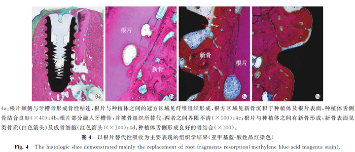 觀察到兩種結(jié)果。第一種結(jié)果主要表現(xiàn)為根片發(fā)生替代性吸收。頰側(cè)牙槽嵴未見(jiàn)明顯吸收,根片頰側(cè)與牙槽骨形成骨性愈合,其間無(wú)纖維結(jié)締組織,根片部分融入牙槽骨,并被骨組織所替代,兩者之間界限不清(圖4a、圖4b)。根片與種植體之間部分區(qū)域見(jiàn)纖維組織形成,部分區(qū)域見(jiàn)新骨充填,新骨表面見(jiàn)類骨質(zhì)及成骨細(xì)胞(圖4a、圖4c)。種植體舌側(cè)骨結(jié)合良好(圖4a、圖4d)。