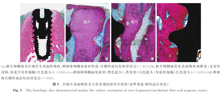 第2種主要表現(xiàn)為根片發(fā)生表面吸收。頰側(cè)牙槽嵴未見(jiàn)明顯吸收。根片頰側(cè)面同時(shí)見(jiàn)表面吸收及成牙骨質(zhì)細(xì)胞修復(fù),軟組織內(nèi)未見(jiàn)炎性浸潤(rùn)(圖5a、圖5b)。種植體頰側(cè)面見(jiàn)新骨、類骨質(zhì)及成骨細(xì)胞(圖5c),種植體舌側(cè)形成良好的骨結(jié)合(圖5a、圖5d)。