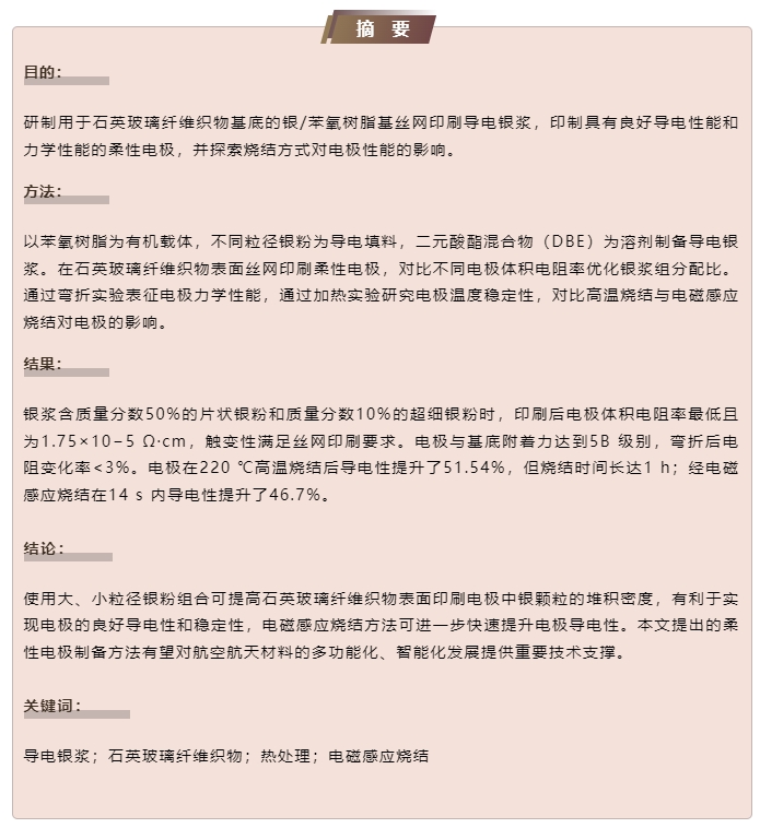 本文選取典型航空、航天復(fù)材用力學(xué)增強(qiáng)柔性材料石英玻璃纖維織物為基底,以微米級(jí)片狀銀粉為主體導(dǎo)電填料,以小粒徑超細(xì)銀粉與樹枝狀銀粉作為輔助導(dǎo)電填料,以與石英玻璃纖維黏結(jié)牢固、韌性好的苯氧樹脂作為有機(jī)載體,通過研究銀粉形貌、銀粉摻雜量對(duì)銀漿導(dǎo)電性的影響,制備出一種電學(xué)、力學(xué)性能俱佳的導(dǎo)電銀漿,經(jīng)185 ℃加熱固化后得到柔性電極,研究并對(duì)比高溫?zé)Y(jié)與電磁感應(yīng)燒結(jié)2 種燒結(jié)方法對(duì)電極性能的影響,通過電磁感應(yīng)燒結(jié)方法快速提升柔性電極的導(dǎo)電性。