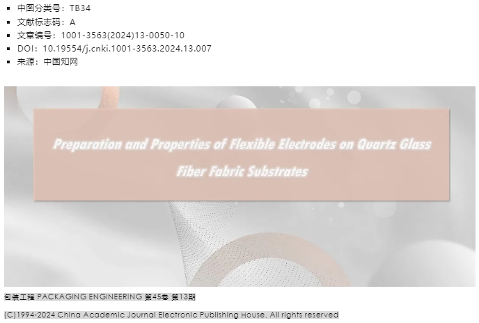 近年來,隨著電子工業(yè)的迅猛發(fā)展,可變形、耐彎折、易加工的柔性電路及其器件逐漸引起重視[1]。石英玻璃纖維織物,又名石英玻纖布,具有高強(qiáng)度、絕緣、耐溫、柔性、多孔等特征,是航空、航天用玻璃纖維增強(qiáng)樹脂復(fù)合材料的主要力學(xué)增強(qiáng)材料之一[2]。以石英玻璃纖維織物為柔性襯底制備柔性電路,可為傳統(tǒng)航空、航天材料賦予新功能,有望對(duì)航空、航天飛行器的減重和設(shè)計(jì)優(yōu)化提供重要技術(shù)支撐。柔性電極是柔性電路的重要組成單元,開展石英玻璃纖維織物表面高質(zhì)量柔性電極制備技術(shù)的研究,對(duì)印刷電子技術(shù)在航空航天領(lǐng)域的發(fā)展和應(yīng)用推廣具有重要意義。
