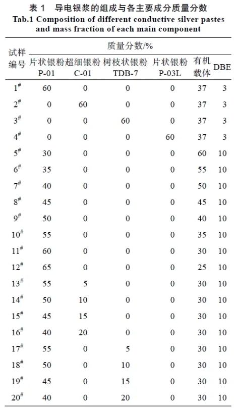 主要材料:片狀銀粉P-01、超細(xì)銀粉C-01、片狀銀粉P-03L、樹枝狀銀粉TDB-7,廣東羚光新材料股份有限公司;DBE 溶劑,元利化學(xué)集團(tuán)股份有限公司;苯氧樹脂,Mw=50 000,大連連晟貿(mào)易有限公司;石英玻璃纖維織物,湖北菲利華石英玻璃股份有限公司。
