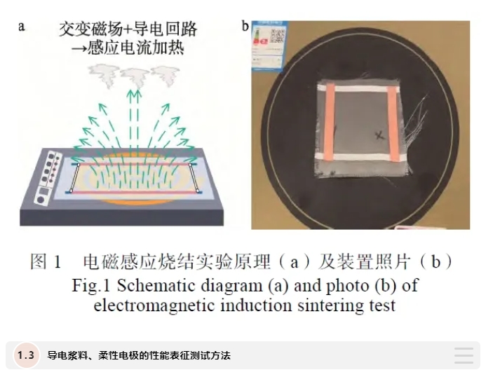 不同于PI、PET 等傳統(tǒng)致密基材,石英玻璃纖維織物具有網(wǎng)孔編織結(jié)構(gòu),網(wǎng)孔平均直徑為20 μm,基于小尺寸銀顆粒、低黏度的導(dǎo)電銀漿在印刷時(shí)極易滲透穿過織物網(wǎng)孔,造成固化后電極導(dǎo)電性降低,需選擇合適尺寸的銀顆粒并調(diào)控導(dǎo)電漿料組分比例,以實(shí)現(xiàn)良好的印刷性能,進(jìn)而提高電極的導(dǎo)電性能。另外,該織物具有較好的耐高溫性,在400 ℃仍可保持較高的力學(xué)性能,研究人員可利用其較好的耐高溫性調(diào)整電極固化與燒結(jié)策略,以電磁感應(yīng)燒結(jié)方式實(shí)現(xiàn)電極部位的快速燒結(jié)。該方法的原理是利用交變磁場(chǎng)在閉合導(dǎo)電通路中產(chǎn)生感應(yīng)電動(dòng)勢(shì)和交變感應(yīng)電流,并以焦耳發(fā)熱形式快速提升導(dǎo)電通路的溫度[8-10],且對(duì)無印刷導(dǎo)電通路的基底部位幾乎不加熱,因此該方法在保證電極被高效燒結(jié)同時(shí)對(duì)石英玻璃纖維織物基底產(chǎn)生的熱損傷較小。