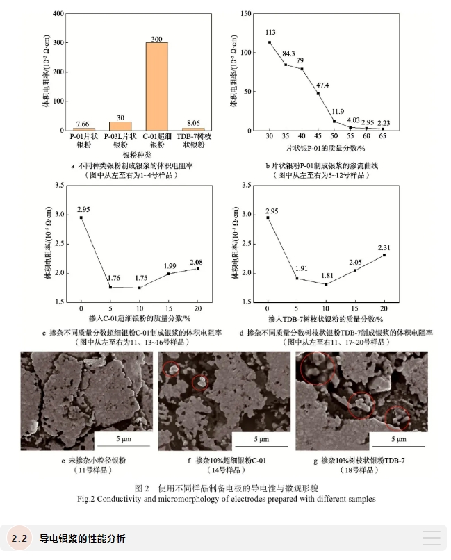 1.2.1 有機(jī)載體的制備稱取3 g 苯氧樹脂和7 g DBE 溶劑并加入錐形瓶中,在75 ℃水浴、轉(zhuǎn)速為300 r/min 的攪拌條件下溶解5 h,使用非介入式材料均質(zhì)機(jī)將上述液體高速旋轉(zhuǎn)消泡和進(jìn)一步混勻,得到有機(jī)載體備用。1.2.2 銀/苯氧樹脂基導(dǎo)電銀漿的制備如表1 所示,按比例稱量一定量的銀粉、有機(jī)載體、DBE 溶劑,將有機(jī)載體和DBE 溶劑在燒杯中攪拌均勻,隨后加入銀粉,靜置3 h,隨后轉(zhuǎn)移到非介入式材料均質(zhì)機(jī)中均質(zhì)。使用三輥研磨機(jī)對(duì)均質(zhì)后的漿料進(jìn)行研磨,使得銀粉在銀漿中分散均勻,研磨5遍后得到導(dǎo)電銀漿。1.2.3 電極的制備將石英玻璃纖維織物平鋪在印刷機(jī)承印平臺(tái)表面后,調(diào)整刮刀角度為60°,調(diào)整網(wǎng)距為3 mm,在一定印刷壓力下將導(dǎo)電銀漿刮印在石英玻璃纖維織物表面。將印刷好的織物置于185 ℃烘箱中,加熱30 min 使導(dǎo)電銀漿固化,完成印刷電極的制備。1.2.4 電極的燒結(jié)高溫?zé)Y(jié):經(jīng)過固化后(185 ℃、30 min)的電極放置于恒溫電熱板表面,根據(jù)實(shí)驗(yàn)設(shè)計(jì)將燒結(jié)溫度設(shè)定在210~250 ℃,時(shí)間設(shè)定在1~5 h。電磁感應(yīng)燒結(jié):電磁感應(yīng)燒結(jié)裝置示意圖及實(shí)物照片如圖1 所示。按圖1b 所示實(shí)驗(yàn)照片示例,組裝電磁感應(yīng)燒結(jié)實(shí)驗(yàn)裝置,使用2 個(gè)金屬片(本實(shí)驗(yàn)使用銅片,長(zhǎng)度為100 mm、寬度為10 mm、厚度為1 mm)、導(dǎo)電銅膠帶(雙面帶導(dǎo)電膠)與印刷在石英玻璃纖維織物表面且經(jīng)過固化后(185 ℃、30 min)的2 條平行電極黏接為閉合導(dǎo)電矩形,將閉合導(dǎo)電矩形放置于電磁爐表面中心位置,設(shè)定電磁感應(yīng)燒結(jié)功率為0.5 kW,啟動(dòng)電源后計(jì)時(shí)14 s 停止燒結(jié),并移除銅片和導(dǎo)電銅膠帶。按本文實(shí)際研究順序列出表征導(dǎo)電漿料、電極性能的測(cè)試方法如下。1)電極導(dǎo)電性能測(cè)試:利用四探針電阻測(cè)試儀與共聚焦顯微鏡測(cè)量電極表面的電阻與厚度,計(jì)算導(dǎo)電銀漿的體積電阻率ρ。2)銀漿流變性能測(cè)試:利用流變儀測(cè)試導(dǎo)電銀漿的黏度曲線、振幅掃描曲線、3ITT(Three Interval Thixotropy Test)曲線。3)銀漿熱重分析:利用熱重分析(TGA)分析銀漿的固化溫度與電極的服役溫度范圍。4)樹脂熱穩(wěn)定性測(cè)試:對(duì)銀漿中使用的苯氧樹脂原材料進(jìn)行熱穩(wěn)定性測(cè)試。將2 組苯氧樹脂顆粒樣品放置于玻璃片表面,分別在220 ℃或250 ℃下加熱5 h,冷卻至室溫后,將融化后黏接在玻璃片表面的苯氧樹脂90°豎直放置于烘箱中,豎直狀態(tài)下分別在220 ℃或250 ℃下加熱1 h 并觀察其是否流淌。相機(jī)拍照記錄加熱前后樹脂外觀。5)電極耐彎折性能測(cè)試:在石英玻璃纖維織物表面制備一條電極,使用電阻儀測(cè)試印制電極的首尾兩端電阻R1。在電極長(zhǎng)軸方向等間距取5 個(gè)點(diǎn)作為彎折位置,將直徑為8 mm 的圓棒垂直于電極長(zhǎng)軸放置在彎折位置,電極繞圓棒1 周,持續(xù)60 s 后電極恢復(fù)平鋪。測(cè)量電極首尾兩端電阻R2。|R2?R1|/R1 為彎折前后電極的電阻變化率,用于評(píng)判電極的耐彎折性能。6)電極附著力測(cè)試:根據(jù)GB/T 9286—2021《色漆和清漆 劃格試驗(yàn)》對(duì)電極與基底織物附著力進(jìn)行表征。7)電極燒結(jié)前后導(dǎo)電性測(cè)試與微觀形貌表征:利用四探針電阻測(cè)試儀測(cè)量燒結(jié)前后電極的表面電阻。使用掃描電鏡對(duì)電極未燒結(jié)區(qū)域與電磁感應(yīng)燒結(jié)區(qū)域拍攝顯微照片,并觀察形貌變化。本文進(jìn)行的實(shí)驗(yàn)研究總體分為2 個(gè)階段。第1 階段以印制電極體積電阻率為唯一指標(biāo)篩選、優(yōu)化導(dǎo)電銀漿配比,對(duì)20 組控制變量配比制備的導(dǎo)電銀漿印制電極進(jìn)行導(dǎo)電性測(cè)試,得到優(yōu)選配比銀漿(表1 中14 號(hào)導(dǎo)電銀漿),明確了下一階段的研究對(duì)象。第2階段圍繞該優(yōu)選銀漿的應(yīng)用性進(jìn)行研究,主要對(duì)該優(yōu)選銀漿的流變性能、熱穩(wěn)定性能,以及該銀漿印制電極的力學(xué)性能、燒結(jié)特性進(jìn)行研究。因此第2 階段的研究對(duì)象僅包含第1 階段優(yōu)選導(dǎo)電銀漿及其印制電極,不再涉及其余19 組配比銀漿。導(dǎo)電性能是電極最重要的評(píng)價(jià)標(biāo)準(zhǔn)。高導(dǎo)電電極能夠有效地傳導(dǎo)電流,從而降低器件使用中的能量損耗,顯著提高器件工作效率[11-14]。對(duì)導(dǎo)電填料的粒徑、形貌、質(zhì)量分?jǐn)?shù)以及組成比例進(jìn)行控制變量實(shí)驗(yàn)與導(dǎo)電性能表征對(duì)比,直至優(yōu)選導(dǎo)電漿料的配比。2.1.1 銀粉形貌與粒徑對(duì)導(dǎo)電性的影響控制銀質(zhì)量分?jǐn)?shù)為60%不變,單獨(dú)選擇一種銀粉來制備導(dǎo)電銀漿,通過導(dǎo)電性對(duì)比篩選出導(dǎo)電銀漿的主要導(dǎo)電填料。圖2a 反映了銀質(zhì)量分?jǐn)?shù)為60%時(shí),不同粒徑與形貌的銀粉制得的銀漿(表1 中1~4 號(hào)樣品)固化后體積電阻率的差異。當(dāng)導(dǎo)電填料質(zhì)量分?jǐn)?shù)為60%時(shí),僅使用超細(xì)銀粉C-01(2 號(hào)樣品)、樹枝狀銀粉TDB-7(3 號(hào)樣品)、粒徑6.57 μm 片狀銀