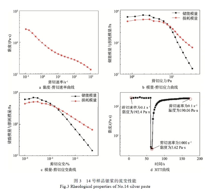 主要儀器:EXAKT 50 三輥研磨機(jī),德國(guó)艾卡特公司;ZYMC-350VS 非介入式材料均質(zhì)機(jī),深圳市中毅科技有限公司;RTS-9 四探針電阻測(cè)試儀,廣州四探針科技有限公司;HP-4060FV 絲網(wǎng)印刷機(jī),東莞好合機(jī)械有限公司;SU8020 掃描電子顯微鏡,日本HITACHI 公司;MCR302e 流變儀,安東帕(上海)商貿(mào)有限公司;DHG-9070A 電熱鼓風(fēng)烘箱,上海一恒科學(xué)儀器有限公司;DS12-35 恒溫電熱板,天津市萊玻特瑞儀器設(shè)備有限公司;3500 W 電磁爐,中山市歐國(guó)電器有限公司。