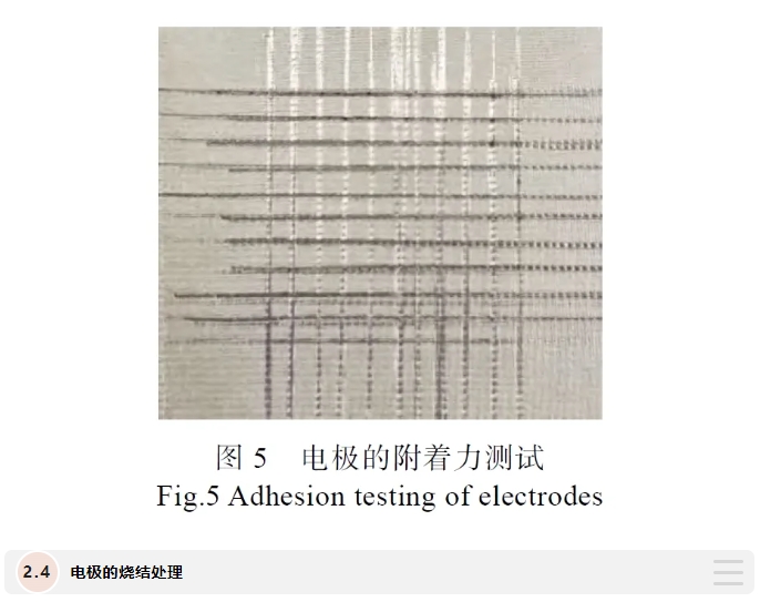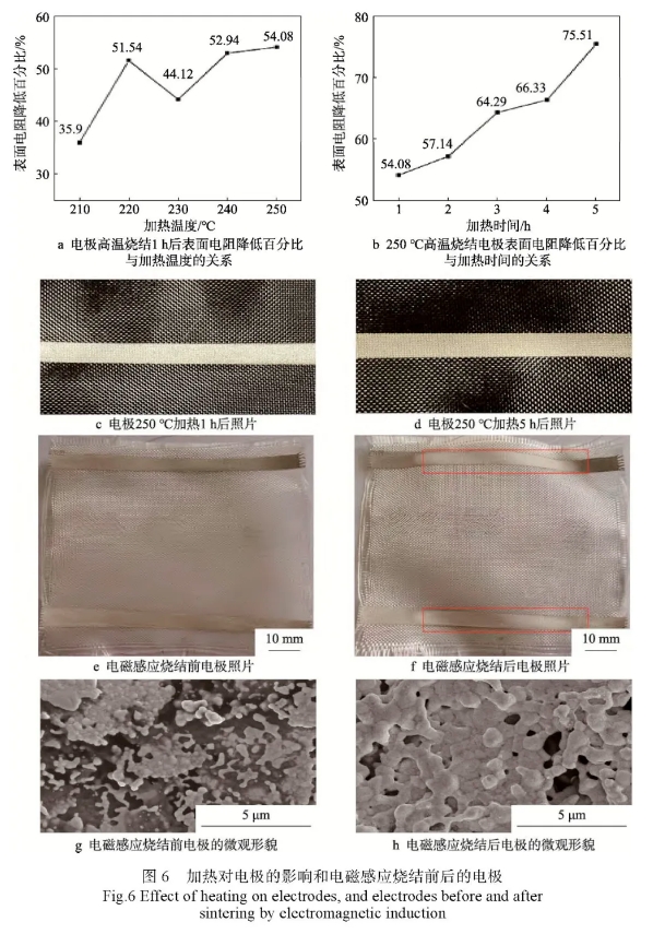 綜合本小節(jié)、圖4b 與圖4c 所示的實(shí)驗(yàn)結(jié)果,可得出本體系柔性電極合理的高溫?zé)Y(jié)方法:對(duì)電極施加220 ℃、1 h 高溫?zé)Y(jié),可以實(shí)現(xiàn)導(dǎo)電性能有效提升,提升幅度約為51.54%。而250 ℃長(zhǎng)時(shí)間燒結(jié)會(huì)加速柔性電極老化,并可能使電極發(fā)生形變,因此電極高溫?zé)Y(jié)溫度不宜選用250 ℃。印刷電極的樹脂老化現(xiàn)象可能會(huì)降低電極與基底之間的附著力,因此在電極燒結(jié)時(shí)需要考慮電極與基底的結(jié)合強(qiáng)度、耐溫性能與加熱時(shí)間,避免因長(zhǎng)時(shí)間加熱導(dǎo)致性能受損,有必要開發(fā)一種對(duì)基底損傷小、總體加熱時(shí)間短的燒結(jié)方法。2.4.2 電磁感應(yīng)燒結(jié)實(shí)驗(yàn)電磁感應(yīng)燒結(jié)是一種快速高效的銀電極燒結(jié)方式。在電磁燒結(jié)功率為0.5 kW、時(shí)間為14 s 燒結(jié)時(shí),電極溫度升高,電極顏色從電極中部開始由暗黃色(見圖6e)逐漸變?yōu)榘咨ㄒ妶D6f),燒結(jié)前電極平均表面電阻為30.4 mΩ/□、燒結(jié)后電極白色區(qū)域平均表面電阻為16.2 mΩ/□。對(duì)比燒結(jié)實(shí)驗(yàn)前后掃描電鏡圖(圖6g 與圖6h)可知,電磁感應(yīng)燒結(jié)前銀顆粒分散在樹脂載體中,彼此間距較大;電磁感應(yīng)燒結(jié)后銀顆粒相互熔接,有利于電極導(dǎo)電性的提升。燒結(jié)過程中電極由暗黃色逐漸變?yōu)榘咨?,是燒結(jié)過程中存在樹脂分解與棕黑色氧化銀受熱分解為白色的銀二者共同導(dǎo)致的宏觀現(xiàn)象。電極中的銀元素在導(dǎo)電漿料制備、絲網(wǎng)印刷、烘箱烘干固化過程中與氧氣作用,發(fā)生了部分氧化,生成棕黑色氧化銀或其他銀氧化物,因此宏觀上電極在固化后呈現(xiàn)暗黃色(圖6e)。在電極的電磁燒結(jié)感應(yīng)過程中各價(jià)態(tài)銀氧化物受熱發(fā)生分解,其中氧化銀在溫度達(dá)到200 ℃時(shí)發(fā)生部分分解生成銀和氧氣,在溫度達(dá)到300 ℃時(shí)完全熱分解并轉(zhuǎn)化為銀和氧氣[18]。因此電磁感應(yīng)燒結(jié)后,觀察到電極(圖6f)較電磁感應(yīng)燒結(jié)前(圖6e)有顏色變白的現(xiàn)象,此現(xiàn)象也說明電磁燒結(jié)過程中電極中段變白部位瞬時(shí)溫度超過200 ℃,且較短的總升溫時(shí)間使電極中樹脂未發(fā)生足夠充分的黃變老化反應(yīng)。在電極未發(fā)生明顯老化現(xiàn)象的前提下,通過對(duì)比燒結(jié)前后電極的表面電阻變化率( 高溫?zé)Y(jié)使表面電阻降低了51.54%,電磁感應(yīng)燒結(jié)使表面電阻降低了46.7%)以及燒結(jié)總時(shí)間(高溫?zé)Y(jié)為1 h,電磁感應(yīng)燒結(jié)為14 s),證明相較于高溫?zé)Y(jié)方法,使用電磁感應(yīng)燒結(jié)方法可有效提高電極-石英玻璃纖維織物的燒結(jié)效率,并且電磁感應(yīng)燒結(jié)對(duì)織物的非閉合導(dǎo)電通路無明顯加熱效果,因此電磁感應(yīng)燒結(jié)在燒結(jié)精確性方面具有明顯優(yōu)勢(shì)。